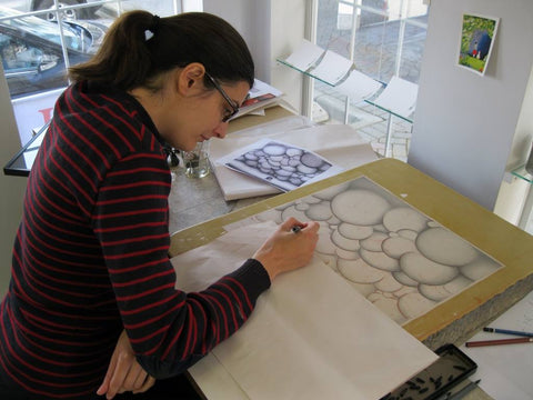 Each print is pulled by hand, maintaining an unbroken chain between artist, stone, and collector. This slow, deliberate process ensures every impression carries its own quiet presence. Through her work, Anaïs invites viewers to pause, breathe, and enter the subtle spaces where the world reveals itself.