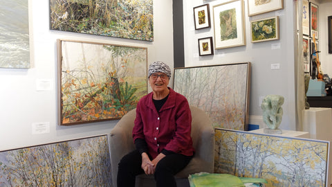 Each piece of tissue is custom hand dyed, dried, ironed prior to being cut and carefully glued to the canvas. There are many layers of tissue required to achieve the deep tones for these masterful tissue paper collage landscapes.