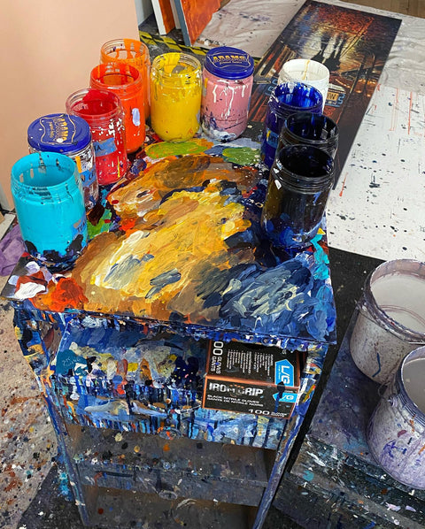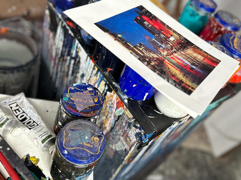 His paintings become kaleidoscopes of light, weather, memory, and movement. Drips, streaks, and layered washes mimic rainfall. Colour shifts mimic twilight, neon, and wet pavement. Through these choices he transforms everyday urban scenes into meditative, atmospheric passages—places that sit between reality and recollection.
