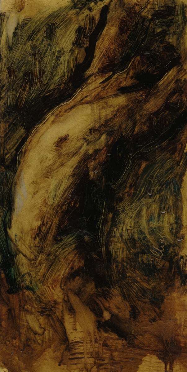 "These male figures are painted on reflective gold surface, their shapes emerging from the darkness. Loved expressing emotion and strength with only a segment of their bodies."