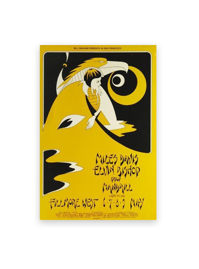 Promoter Bill Graham was very creative when putting together combinations of bands each week. Sometimes it was an all blues show and other times he would mix genres. This show of jazz great Miles Davis, blues legend Elvin Bishop and the eclectic Mandrill is a good example.