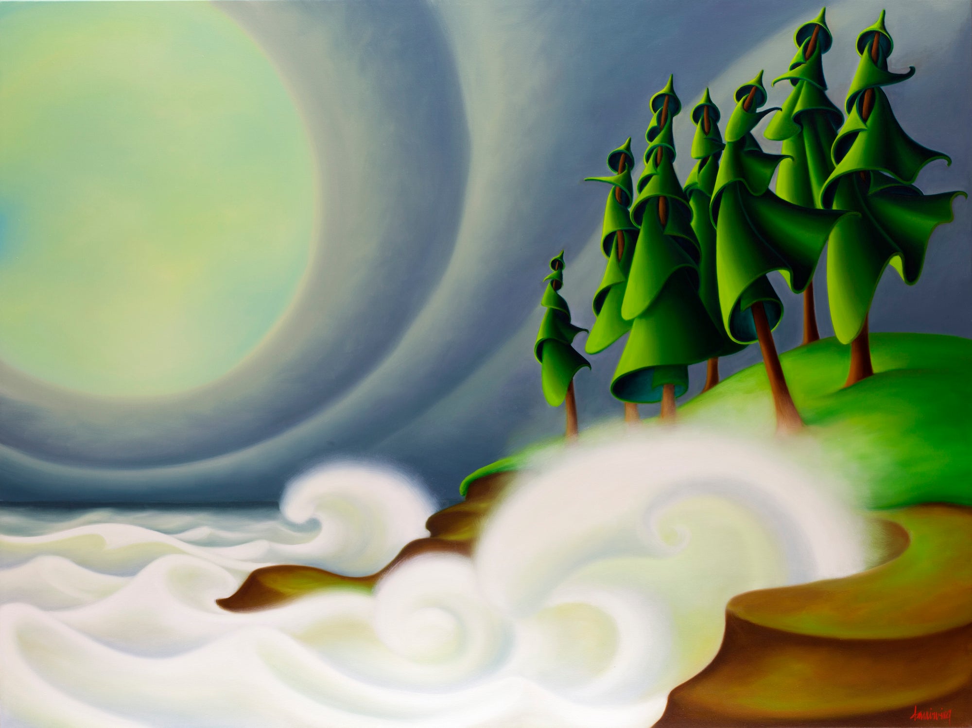 Dana turns her artistic expression toward the spacious forests of ancient trees, the emerald green rivers and the moody weather.