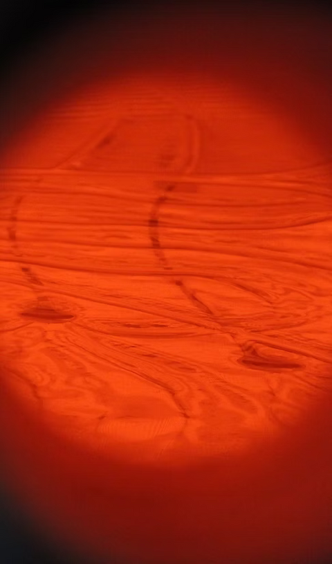The glass is then fired to a temperature of between 1445 and 1495 degrees F. this allows the glass to slowly slump pushing the fibre mold materials into the glass, while allowing the glass to take on the detail of the sand bed.