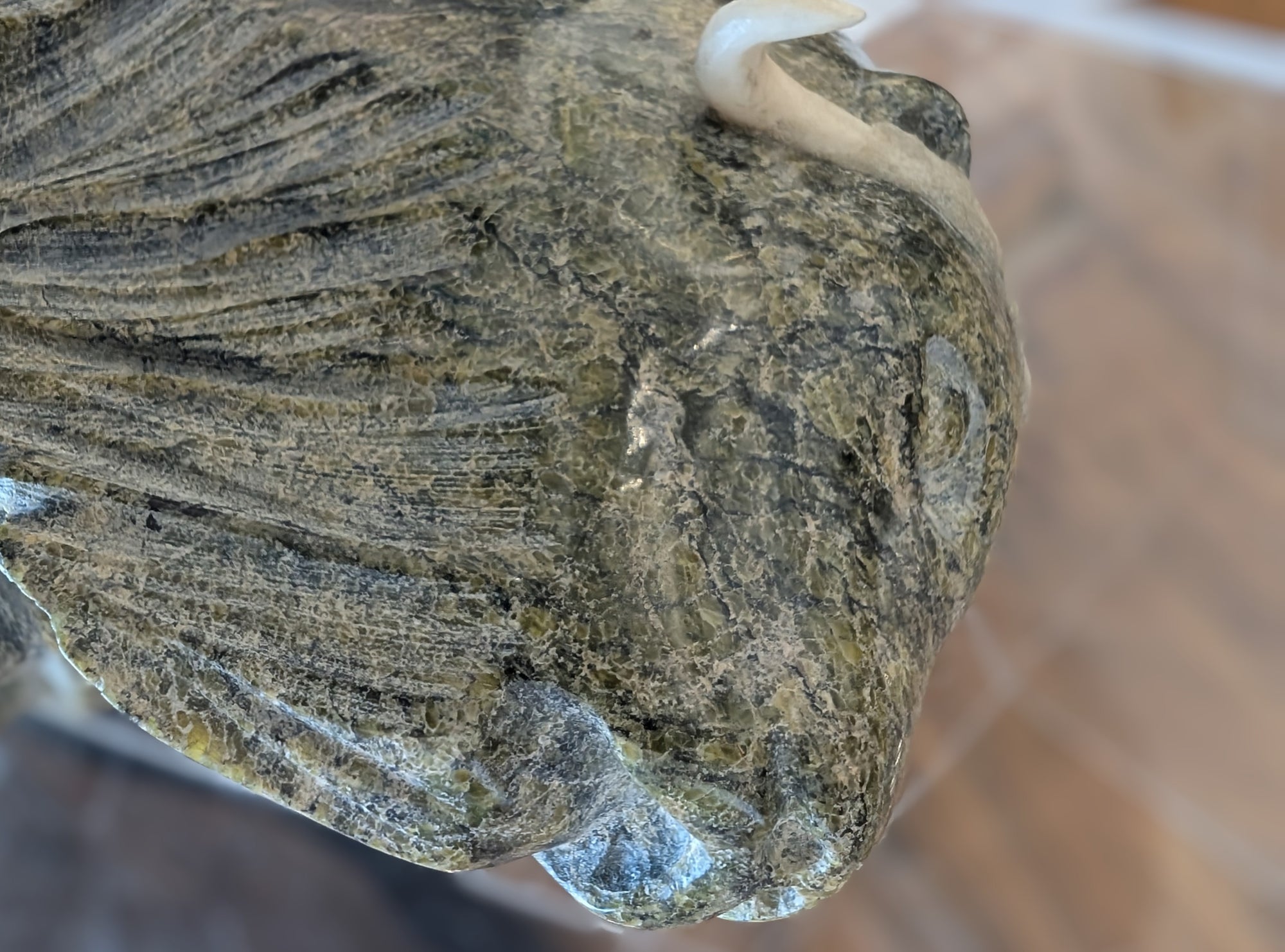 This muskox, carved from the region's signature serpentine—a stone as resilient and enduring as the creature it depicts—stands as a testament to Tikivik's skill. The sculpture's smooth, polished surfaces and lifelike form reflect the naturalistic style characteristic of Kimmirut's art. Delicate details, enhanced with caribou antler, bring the muskox's powerful presence to life.