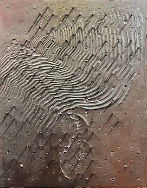 "With this painting I am playing with the sense or idea of a painting as being a precious thing and our desire to get closer to see and touch. This is combined with the sense of a beach, a footprint and the nails. The incongruous nature of these things together. This sense of a painting being a trace or a record of a passing of time, a walk on the beach." -Ron Crawford